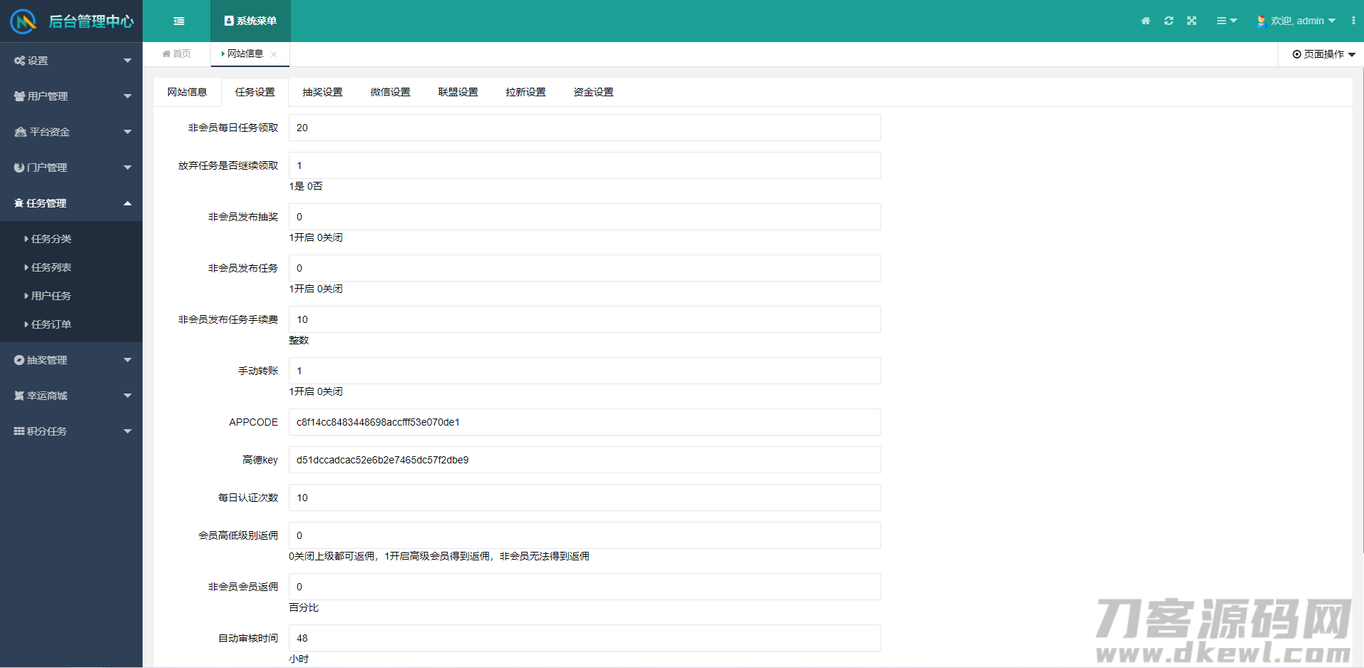 其他设置:包含最低提现设置,最低单个任务发布佣金设置、每日提现次数设置、任务信用分设置,完成不了任务信誉分降低等问题配置。
