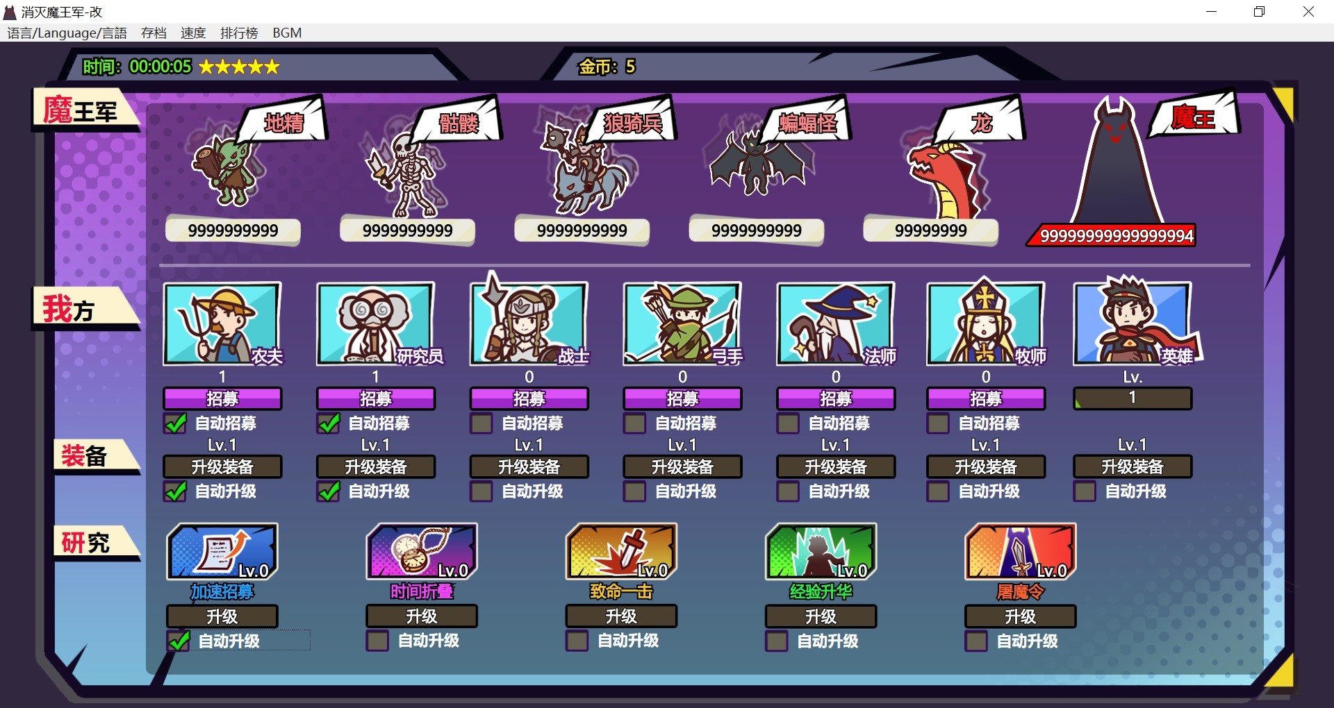 《消灭魔王军-改》是一款半放置策略游戏,招募、升级你的队伍争取在最短时间内消灭魔王军。游戏挂机速度可调,一般可以在数分钟内通关,另有通关竞速排行榜。