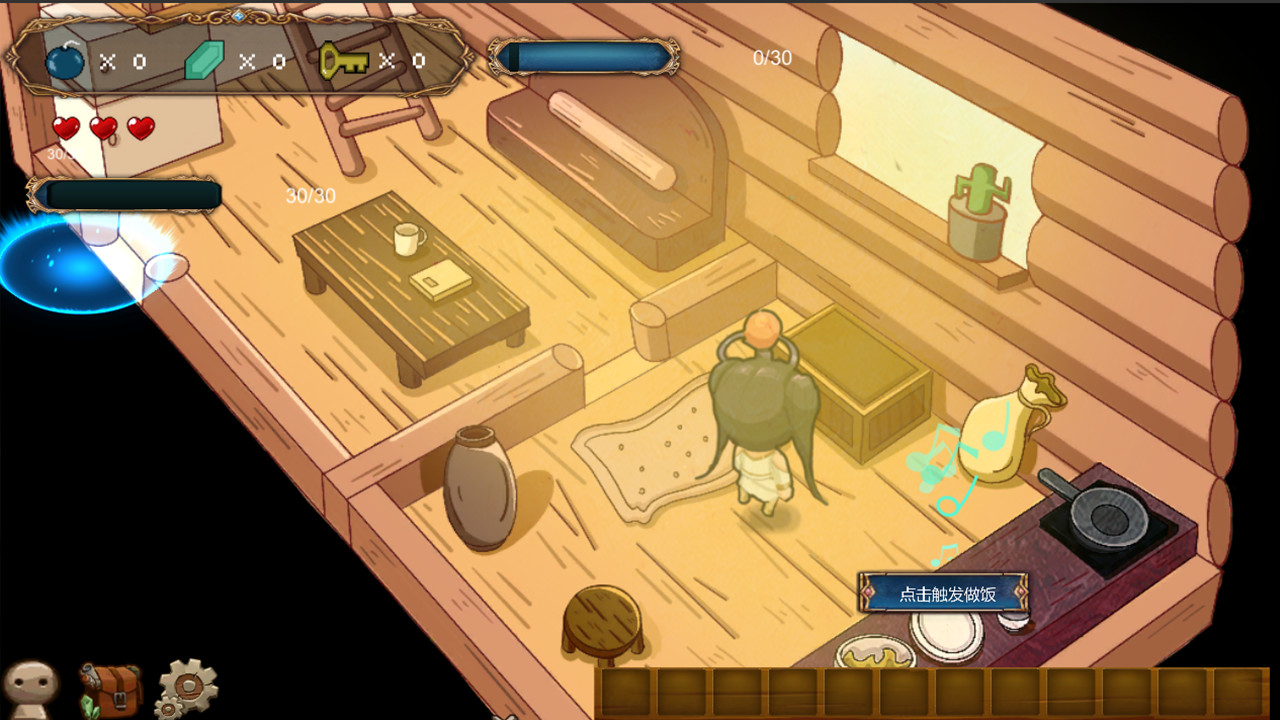 可以在人类村落里休息,制作食物(食用可以恢复生命值),更换装备,与村民对话。